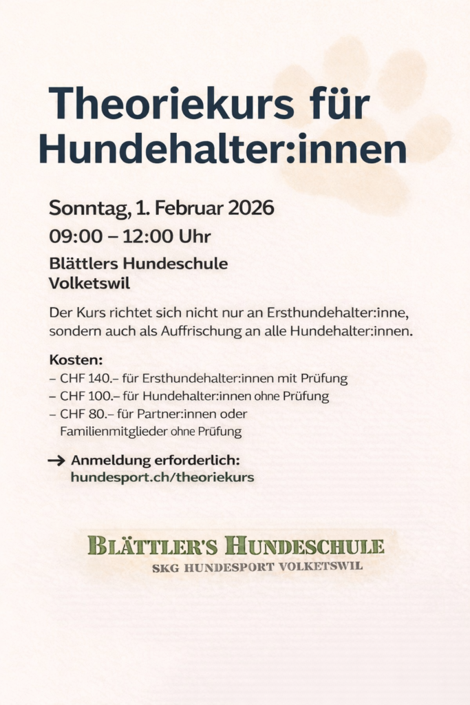 Der Theoriekurs vermittelt die wichtigsten Grundlagen zur Hundehaltung – von rechtlichen Pflichten über das Ausdrucksverhalten des Hundes bis hin zu seinen Bedürfnissen im Alltag. So bist du bestens vorbereitet, bevor dein Hund bei dir einzieht.